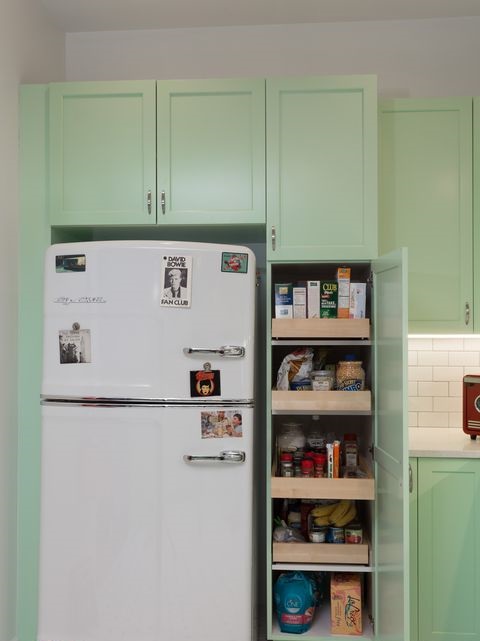 Εκτός από την ανανέωση της εμφάνισης του δωματίου, επανεξετάσαμε επίσης το σχέδιο του δαπέδου, δίνοντας στην κουζίνα μια πιο ανοιχτή διάταξη και λειτουργεία χώρου. Η παράλληλη αποθήκευση τροφίμων που δημιουργείται από το ψυγείο και τα ράφια αποθήκευσης είναι μόνο ένα παράδειγμα αυτού.